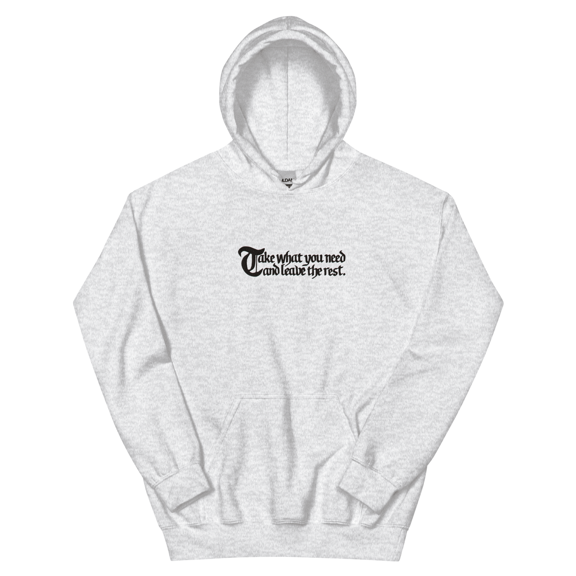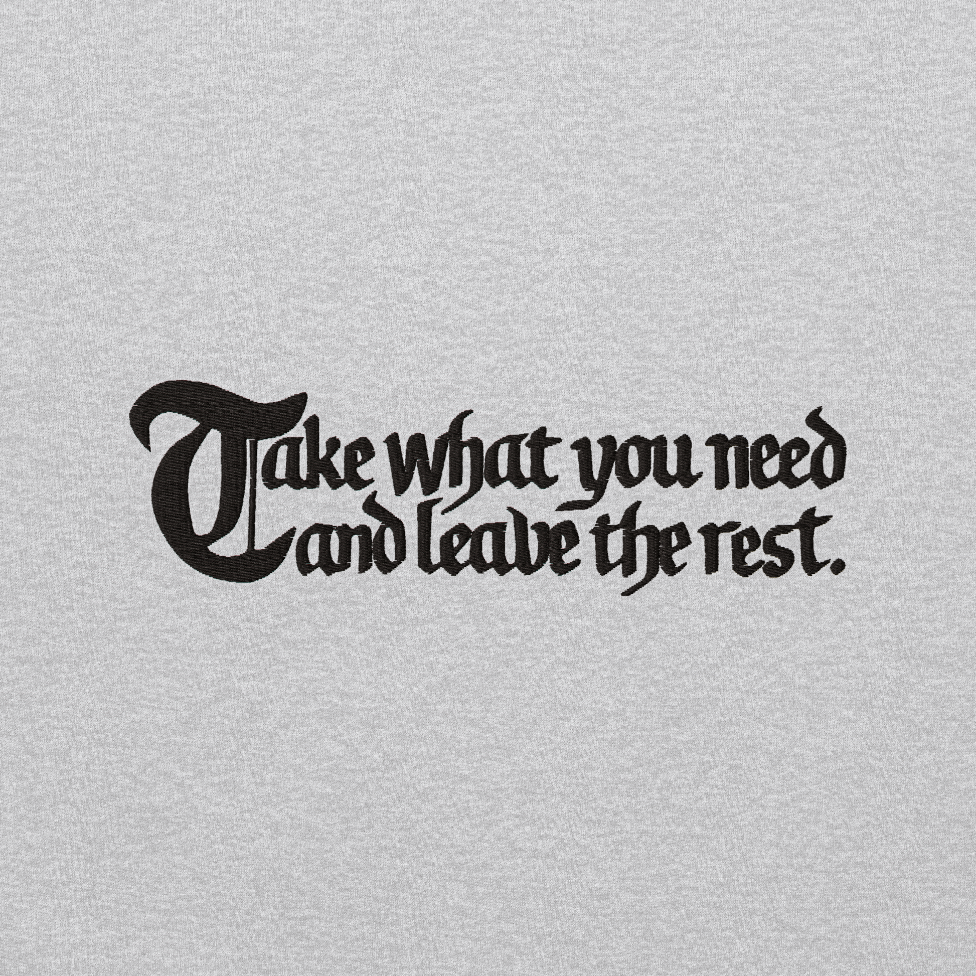 Embroidered on the front: Take what you need and leave the rest.